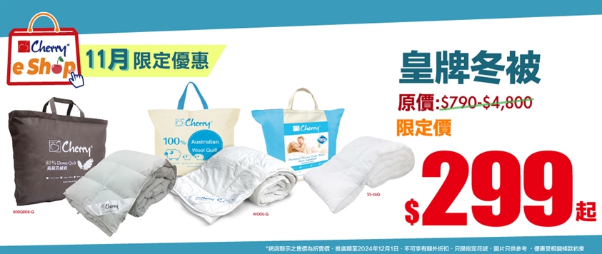 【網店限定】11月優惠推廣期:即日起至2024年12月1日天氣開始轉涼,係時候入手冬被為冬日增添暖意!11月網店優惠為大家精選多款皇牌冬被,包括羽絨被、蠶絲被及羊毛被,限定價$299起,立即把握機會掃貨啦! (點擊以下圖片立即選購)*優惠受條款細則約束。圖片只供參考。